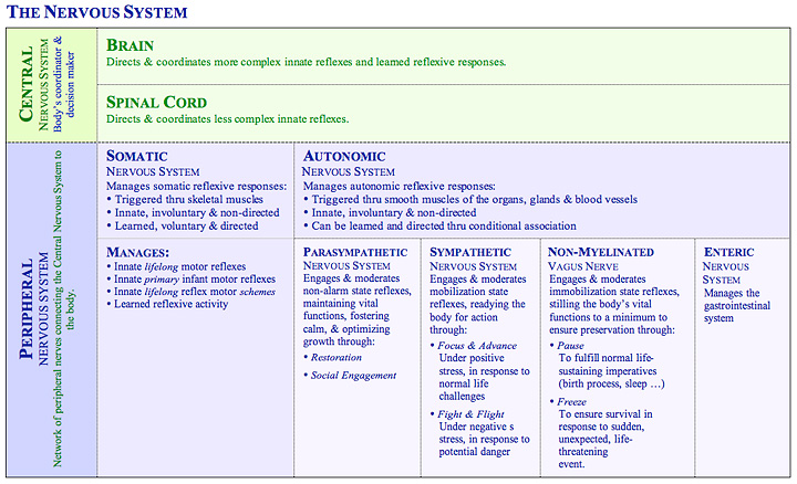 The sibling relationship that exists between the somatic and autonomic nervous systems, as the two major subsystems of the peripheral nervous system, intimately intertwines their function. The autonomic and somatic systems work in a symbiotic fashion, each to inform the other, to ensure the body’s long-term, near-term and immediate survival, while optimizing the potential for development and growth. It is through the healthy function of these two systems that the optimal foundation emotional and behavioral regulation and motor, communication and cognitive maturation and development is best positioned to allow each of us to reach our full potential.