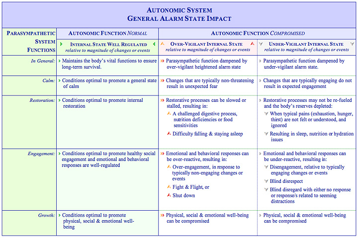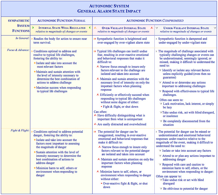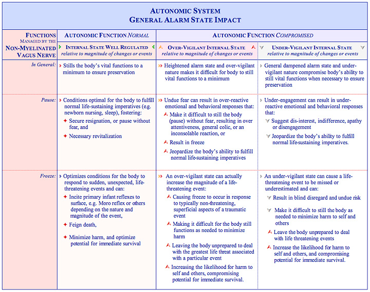 In the same way primary infant motor reflex integration can be used to signal and isolate underlying neural, sensory, and motor response issues, emotional and behavioral dys-regulation can be used to signal autonomic system challenges in moderating and coordinating the body’s internal alarm states. The autonomic system, when moderating and coordinating internal states performs its role in response to external cues from the environment, allocating more or less control to one of three subsystems based on the level of familiarity, the potential for danger, and the immediacy associated with a challenge or threat, as outlined below.